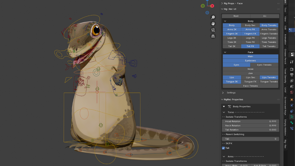 - IK/FK systems - For the limbs, fingers, toes, tongue, and tail.